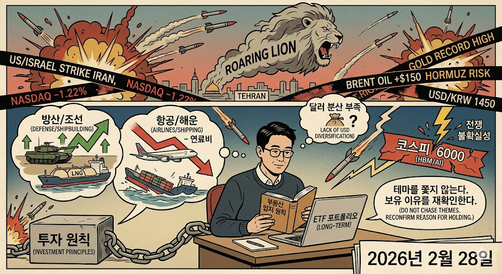2026년 2월 28일, 미국과 이스라엘이 이란을 대상으로 대규모 공습을 단행했습니다. 이른바 '사자의 포효(Roaring Lion)' 작전으로 명명된 이번 공습은 테헤란을 포함한 이란 주요 도시의 핵 시설과 군사 인프라를 겨냥했고, 글로벌 금융시장은 즉각 반응했습니다. 나스닉은 1.22% 하락했고 유가는 급등했으며 금은 사상 최고치를 경신했습니다. 저는 그날 부동산 공부를 하다가 뉴스를 접했는데, 이상하게도 흔들리지 않았습니다. 변수는 예측할 수 없지만 원칙은 지켜야 한다는 걸 이미 경험으로 배웠기 때문입니다.