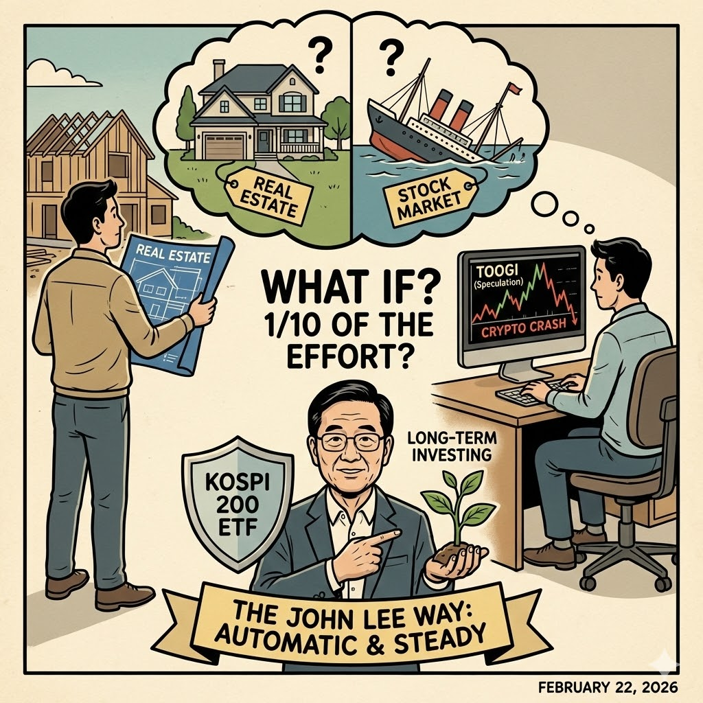 "부동산에 쏟은 에너지의 10분의 1만 주식에 썼다면?" 이 질문이 머릿속을 떠나지 않았습니다. 존리 대표의 인터뷰를 보고 나서 제가 가장 먼저 든 생각입니다. 저는 부동산으로 2채를 만들었습니다. 임장도 다니고 전세가율도 따졌습니다. 그런데 주식은 친구 카톡 보고 샀다가 물렸고, 코인은 불장 소문만 듣고 들어갔다가 반토막 났습니다. 투자가 아니라 투기였던 겁니다.