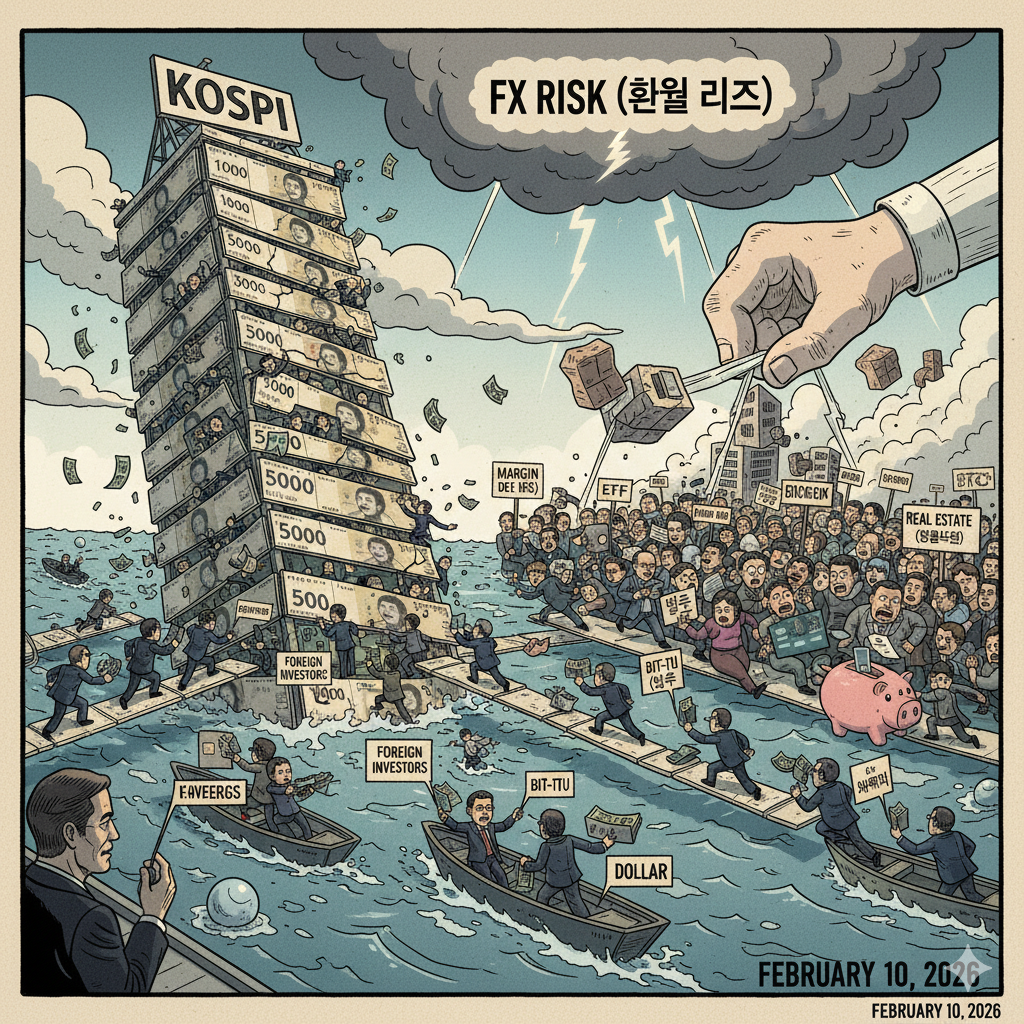 현재 환율이 1,460원대를 유지하고 있는 기형적인 상황은 외국인들이 원화를 달러로 바꿔 한국 시장을 떠나고 있음을 보여주는 결정적 증거입니다. 달러 가치가 안정세를 보임에도 환율이 떨어지지 않는 것은 그만큼 국내 자본 이탈이 심각하다는 뜻입니다. 외국인이 다시 돌아오기 전까지는 코스피의 추세적 상승을 기대하기 어렵습니다. 오히려 일본이나 대만 증시로 자금이 쏠리는 현상은 코스피가 상대적으로 고평가되었다는 외인들의 판단을 뒷받침합니다. 지금은 수익률을 쫓기보다 '자산을 지키는 보험'을 들어야 할 시기입니다. 주도주 위주의 투자를 유지하더라도 현금 비중을 늘리고 외화 자산을 확보하는 등 리스크 관리에 만전을 기해야 합니다. 산이 높으면 골이 깊듯, 레버리지로 끌어올린 시장의 끝은 가혹한 조정을 동반할 수 있습니다. 위기 속에서 기회를 움켜쥐는 사람의 차이는 데이터를 어떻게 읽고 해석하느냐에 달려 있음을 잊지 말아야 합니다. [결론] 결론적으로 코스피 시장은 외국인의 차익 실현과 개인의 과도한 레버리지가 충돌하는 위태로운 구간에 진입했습니다. 부동산 시장의 공급 부족 리스크와 환율 폭등 가능성까지 고려한다면, 지금은 공격적인 투자보다 시장을 관망하며 체력을 비축해야 할 때입니다. 데이터 기반의 냉철한 분석을 통해 거대한 버블이 터지기 전 미리 대비하는 영리한 투자자가 되어야 합니다.
