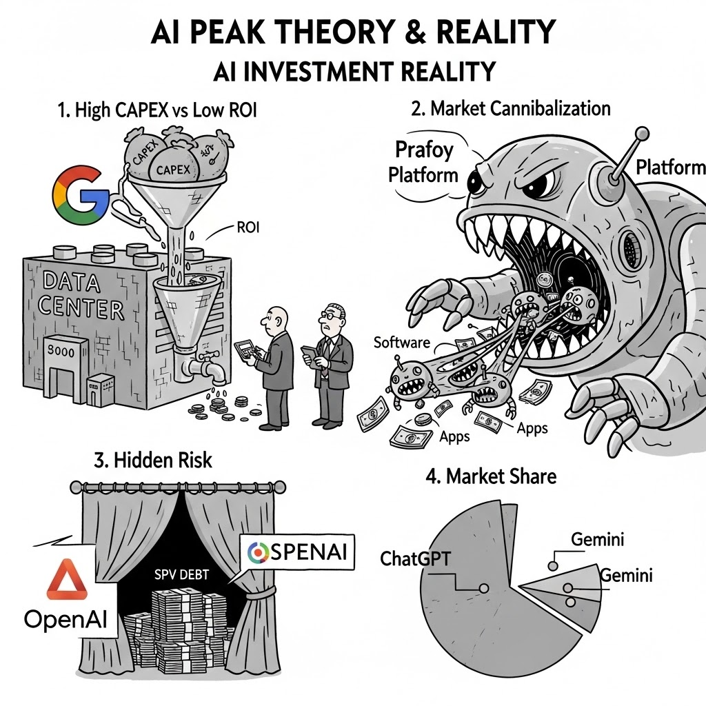 Q. 구글이 자본 지출을 대폭 늘렸는데도 주가가 오르지 않는 이유는 무엇인가요? A. 투자자들은 단순한 지출 규모가 아니라 투자 대비 수익률(ROI)을 더 중요하게 평가합니다. 영업이익이 예상치에 미달했고, 하드웨어 비용과 전기료 상승으로 마진 압박이 우려되기 때문에 지출 확대가 오히려 수익성 악화로 이어질 수 있다는 우려가 반영된 것입니다. Q. AI 소프트웨어 시장에서 점유율이 이동하는 것이 투자에 어떤 의미가 있나요? A. 점유율 변화 자체보다 시장 전체의 파이가 커지는지가 더 중요합니다. 챗GPT에서 제미나이로 사용자가 이동하는 것은 단순한 '이사'일 수 있으며, 실제 총 사용자 수가 증가하지 않는다면 성장성에 한계가 있습니다. 또한 AI가 기존 소프트웨어를 대체하면서 자기잠식 현상이 발생할 수 있으므로, 장기적으로 승자가 될 플랫폼을 신중하게 선택해야 합니다. Q. 오픈AI의 SPV 구조가 투자자에게 미칠 영향은 무엇인가요? A. 특수목적법인을 통한 부채 누락은 단기적으로는 재무제표를 건전하게 보이게 하지만, 상장 과정에서 실제 부채 규모가 공개되면 주가에 부정적 영향을 줄 수 있습니다. 투자자는 오픈AI 상장 시점에 실사 결과를 면밀히 검토하고, 부채 규모와 상환 계획을 확인해야 합니다. Q. 한국 투자자는 현재 AI 관련주에 어떻게 대응해야 하나요? A. AI 테마주에만 집중하지 말고 포트폴리오를 다변화해야 합니다. 실적이 뒷받침되는 고배당 자산주나 바이오 대형주로 일부 자금을 이동시키고, AI를 실제로 활용해 비용 절감이나 매출 증대 효과를 내는 국내 기업을 찾아 투자하는 것이 현명합니다. 반도체 주식을 보유했다면 실적 발표 시 재고 자산과 가이던스 변화를 최우선으로 체크하십시오. --- [출처] 미국 AI고점론에 대한 생각과 구글 실적의 의미 - YouTube: https://youtu.be/y4jt9hrpql8?si=RbO088actiaJ4EYF